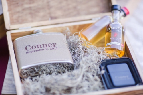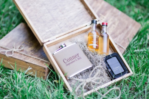 A special gift for the groomsmen is a nice touch! Check out our article here to browse great groomsmen gift ideas (like the wood boxes pictured) such as a flask, mini bottles of his favorite drink, and more.