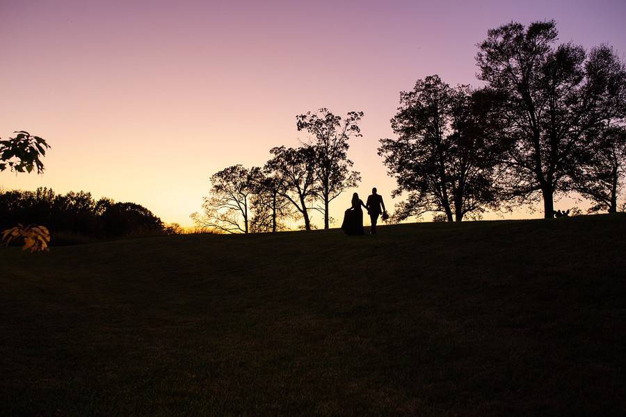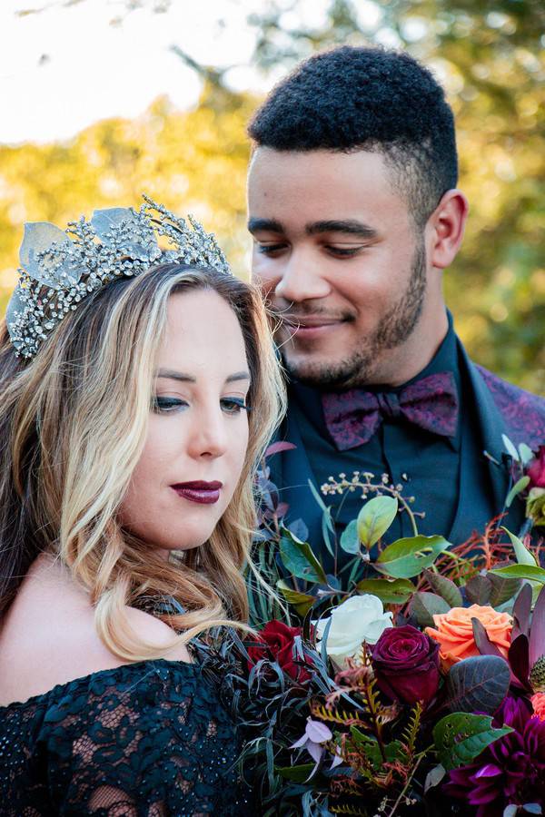 Photographer’s Comments: “Something wicked this way comes to this gorgeous vineyard in the North Carolina Foothills. This daring couple has decided to show everyone the meaning of ’til death do us part. Embracing the deep color palette of the season, this editorial shoot shows that dark and moody can still be bold and colorful. “For the bride, we wanted to bring out her inner enchantress, so your typical bridal white was not the right fit. This beautiful gown from Southern Bride is actually pieces of two Sherry Hill formalwear dresses, customized for our shoot. “The Magnolia Bride completed our look with the glamorous black and silver crown. “The groom wore a burgundy, paisley print tux jacket with a matching bowtie and black accessories. “Our venue was the picturesque ReyLan Vineyards. The planner, Katharine Mann Events, coordinated our shoot with the venue and arranged each setup. “The first location in the woods is were we held our magical first look. The focal point here was the beautiful bouquet of Dahlias, roses, and wild greens. “The florist carried this over to our ceremony site, wrapping a large Juliette frame and tree trunk with florals, and greenery. “We added gray and black candles to complete the scenery. Our sweetheart table was set off with more black and grey tapered candles, a large floral arrangement, and a few velvet accessories to complete the mood. The table settings included twig inspired cutlery and menus designed by the talented Artemisa Calligraphy and Design. “Just like the Stationary Suite, the menus were hand-dyed. The cake was created by our local Publix, with oranges roses added by the team at ReyLan Vineyards. “For our final portion of the shoot, we enveloped our couple in puff of smoke and took a few farewell photos on the dock before the witching hour began.”Gallery