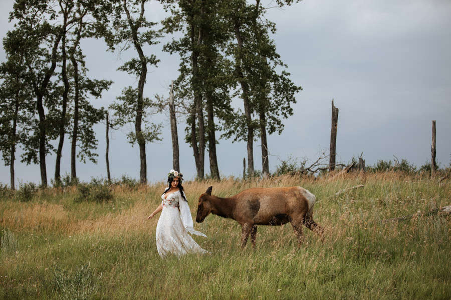Photographer’s Comments: “This styled shoot featured Jolissa and Katie the elk. Katie was fostered by Jolissa and her family and this whole shoot was planned around her. “For this we wanted to incorporate natural fields/woodland area and feature complimentary pieces such as a custom made gown and gorgeous floral creations for both Jolissa and Katie to wear!”Gallery