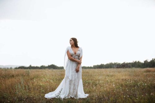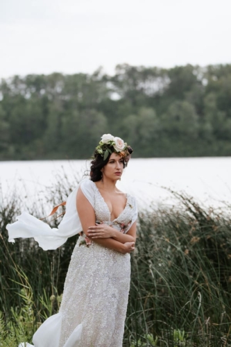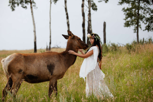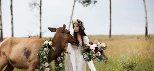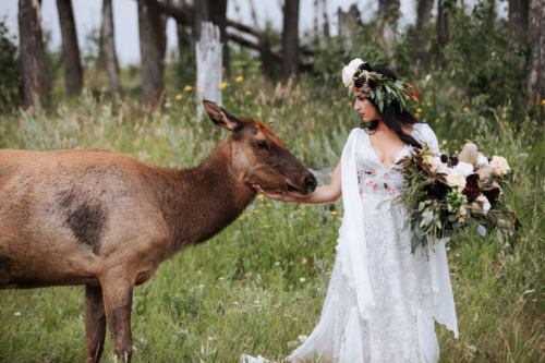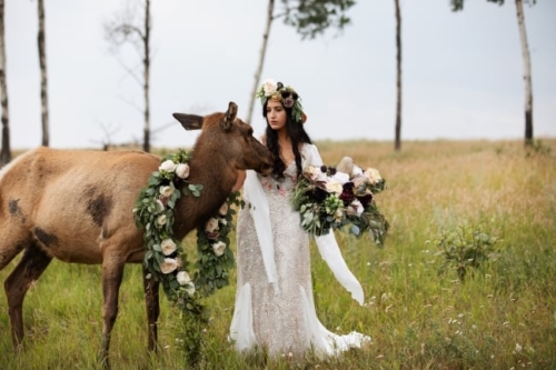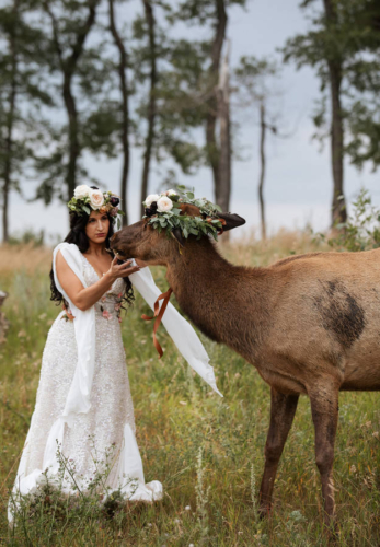 Photographer’s Comments: “This styled shoot featured Jolissa and Katie the elk. Katie was fostered by Jolissa and her family and this whole shoot was planned around her. “For this we wanted to incorporate natural fields/woodland area and feature complimentary pieces such as a custom made gown and gorgeous floral creations for both Jolissa and Katie to wear!”Gallery
