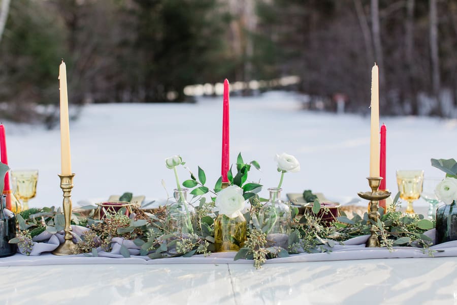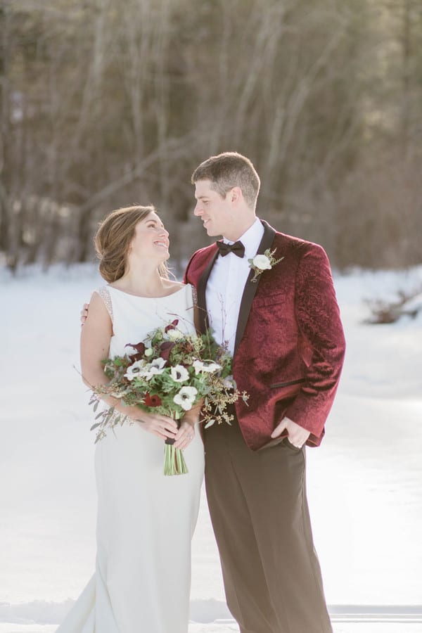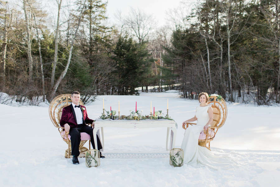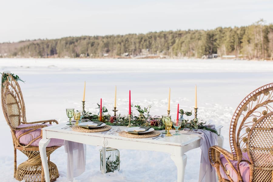 Photographer’s Comments: “We opted to have our gorgeous styled shoot on the ice of Lake Winnipesaukee in . Our couple was the sweetest & walked all over the ice with us. The table was styled with organic pops of color with a stunner of a bouquet and cake!”Gallery