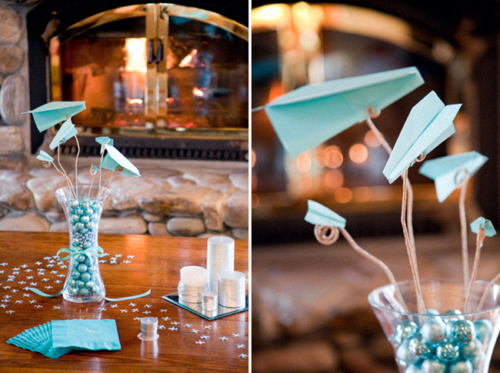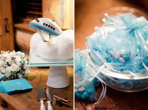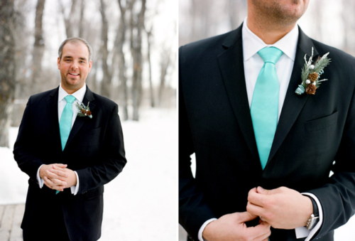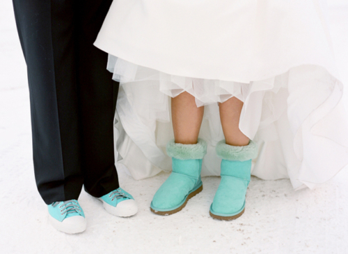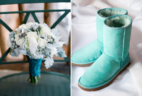 Before winter slips away, we wanted to share this winter wedding in Jackson Hole shot by Carrie Patterson Photography. The beautiful venue is the Bentwood Inn and the photos are simply magical! What a stunning bouquet! And Ashley found blue Uggs that matched her aqua blue color scheme perfectly. The aqua blue color scheme  extended into the decor and favors. This looks so cozy and romantic – snuggle up close next to the fire with the snow falling outside!