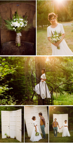 We can’t get enough of this woodland wedding inspiration shoot! We are gawking over all the lovely details, from the twinkle lights to the door ceremony backdrop. It is a dream forest! The beautiful photography by Rebecca Hollis Photography is AMAZING! Here is what La Lune Events had to say about the styling: As designers we wanted to create a styled shoot that was out of the box and a little quirky! Autumn was the perfect time to create a woodland themed wedding inspiration shoot. The inland northwest is rich with woodsy elements and we wanted to show brides how they could incorporate these elements into a wedding in a classy and modern way. We shot on location at the Attic, a vintage rental company, and had complete access to their inventory. Roy Joy Design created the custom menu, invitations, and seating cards with pine needles and other woodland inspired elements. Our baker created a cake resembling a birch tree and La Lune designed the cake topper. Fleurtations Floral designed our centerpieces, bouquet and boutonnieres. She used woodsy elements of grass, feathers, and pinecones for inspiration. Feast provided the delicious food. Her menu incorporated earthy ingredients such as mushrooms, rosemary, sage, figs, and arugula. We wanted our bride in a traditional wedding dress but with elements that tied in the woodland theme. She wore a cashmere sweater, feather jewelry, and boots from CoCo Boutique. La Lune Events created the DIY head piece with feathers and berries. The grooms attire was thrifted but provided a casual and hunter inspired look!Gallery