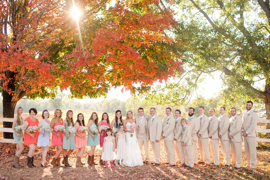 Matt and Tara had a Fall barn wedding on a gorgeous farm just as the leaves were changing colors. The bright attire of her bridal party stand out against the natural setting. I love the bright blue barn door opening into a field where they got married.