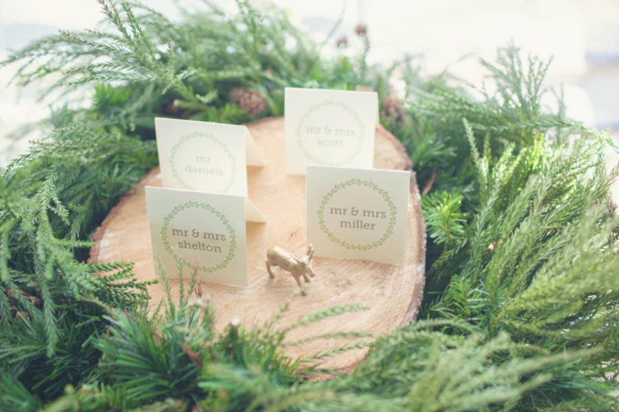 “We incorporated natural elements as well as vintage pieces like herb bottles, cheese boxes, and a mantle, that would make anyone feel as if we had invited them inside a home, which just so happened to be a barn. The woodland creatures spray painted in gold were hidden all over the barn, in between stacks of books and in centerpieces, for a touch of whimsy. We wanted to create a comfy, woodsy, romantic environment to capture all the beauty and richness of a grey winter day.”