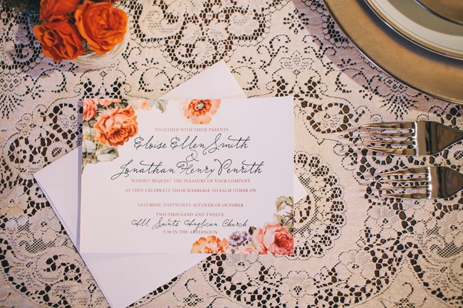 Orange floral design wedding invitation for a vintage fall wedding inspiration shoot