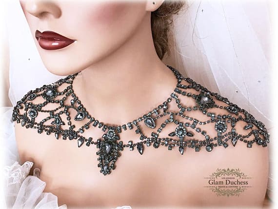 Dramatic choker necklaces made with lace and beading, cascade earrings dripping with jewels, cuffs and finger-less gloves. These are all sumptuous and elegant accessories to consider when planning your gothic wedding attire.