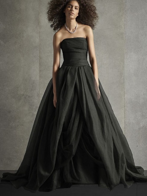 This David’s Bridal gown oozes romance with its off the shoulder silhouette and gorgeous black satin. The gown is perfect for a modern fashion-forward bride or a romantic goth at heart!