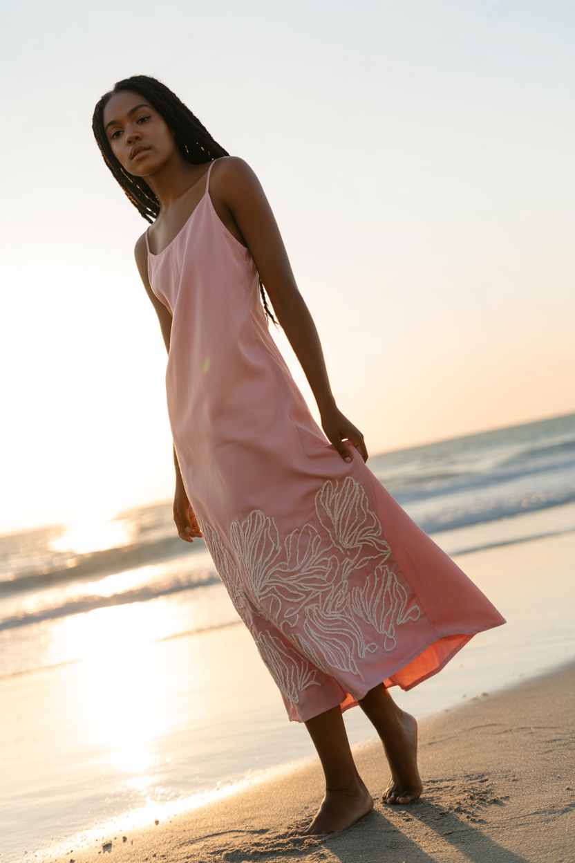 The botanical embroidered hem on this coral slip maxi is what moves it from beach dress to beach wedding dress — the white embroidery is a deliberate embellishment that reads as intentional and occasion-appropriate. The coral sings against a sunset sky in a way that very few other shades can; the slip silhouette is effortlessly flattering in coastal heat; and the barefoot styling confirms this belongs specifically at a sandy or open-air venue rather than an indoor reception. If you have a beach ceremony on the calendar, this is the reference image to bookmark.