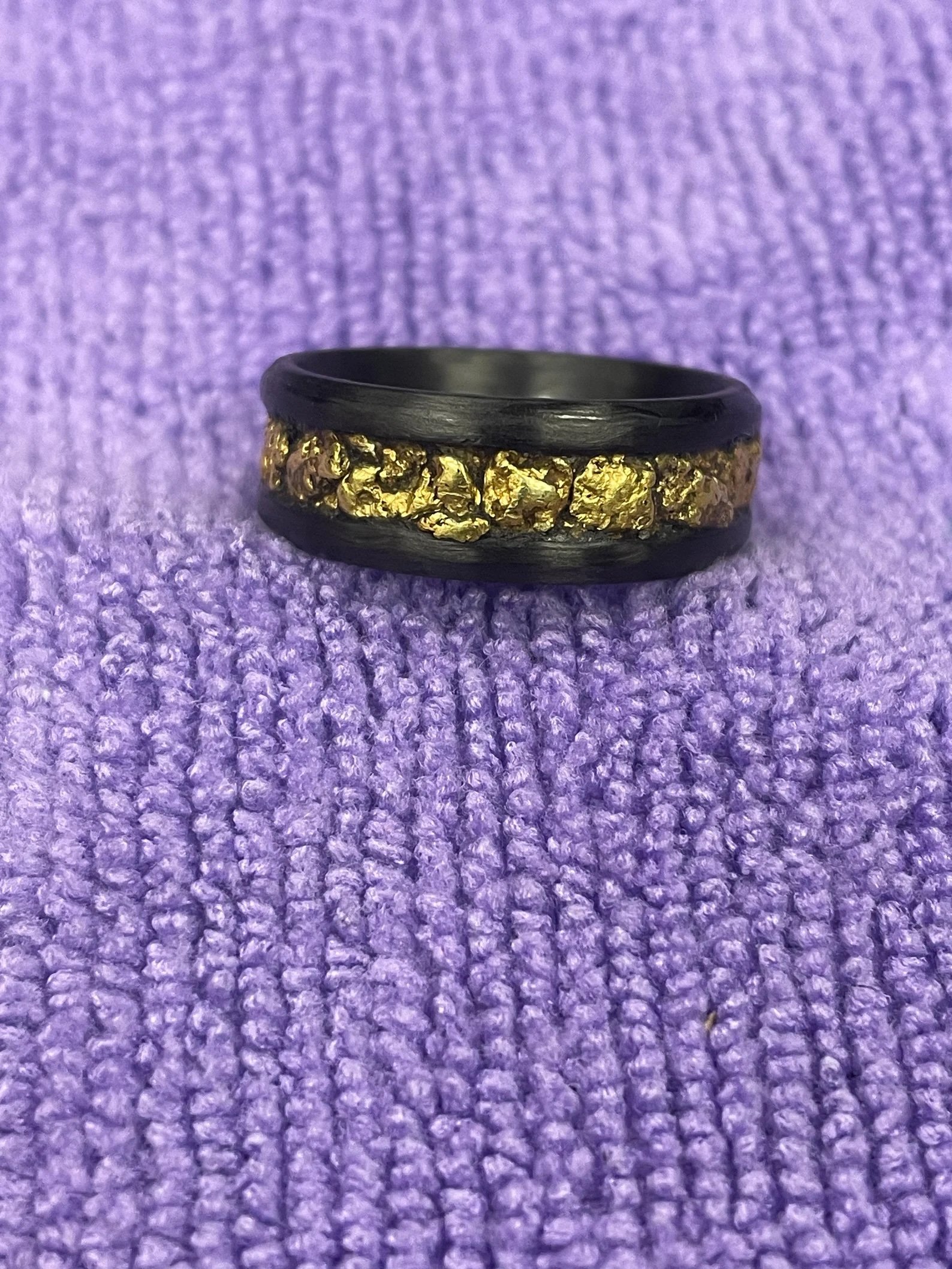 You were lucky enough to find this gem – present him with a ring that represents your good fortune! The band is inlaid with actual real Alaskan gold nuggets! The band is raw, organic, and absolutely perfect for an outdoor rustic wedding, and a rugged man!