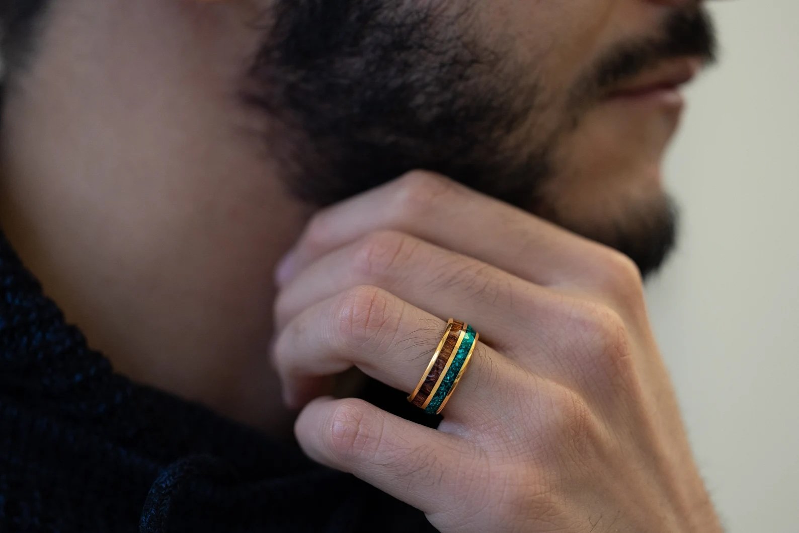 For an outdoorsman, this is the perfect rustic ring. The 8mm tough tungsten band features three distinct and unique inlays: one of exquisite turquoise, another of koa wood, and thirdly, a real deer antler! This piece of jewelry is beautifully crafted and is a conversation starter as such a striking band. The deer antler is customizable so you can select the shade of antler to suit your aesthetic preferences.