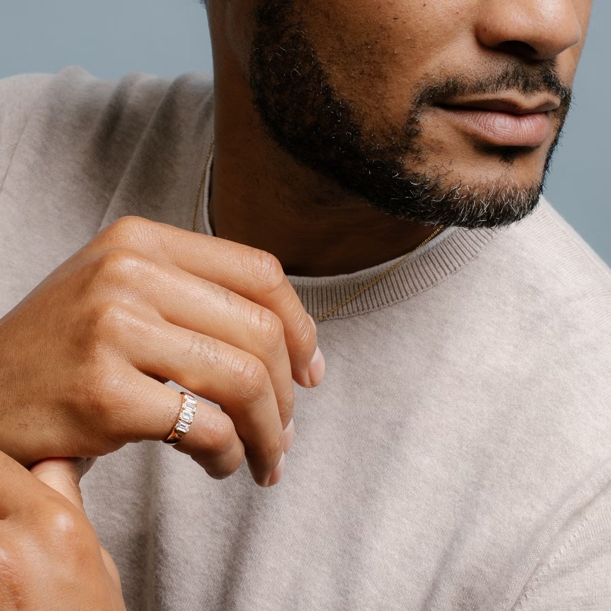 For the modern minimalist who wants something a little different, this square-cut ring is a standout choice. Crafted from gold and set with a sleek black diamond, it’s striking without being flashy — and definitely not your typical band.