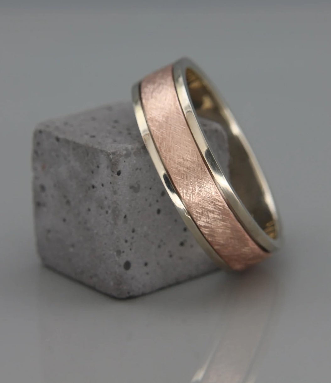 We love the unexpected movement in this design—a brushed rose gold center that spins within a sleek white gold frame. The contrast of warm and cool tones feels modern yet timeless, while the subtle texture keeps it from looking too polished. Available in multiple widths, it’s a versatile choice for someone who wants a wedding band that stands out with quiet sophistication.