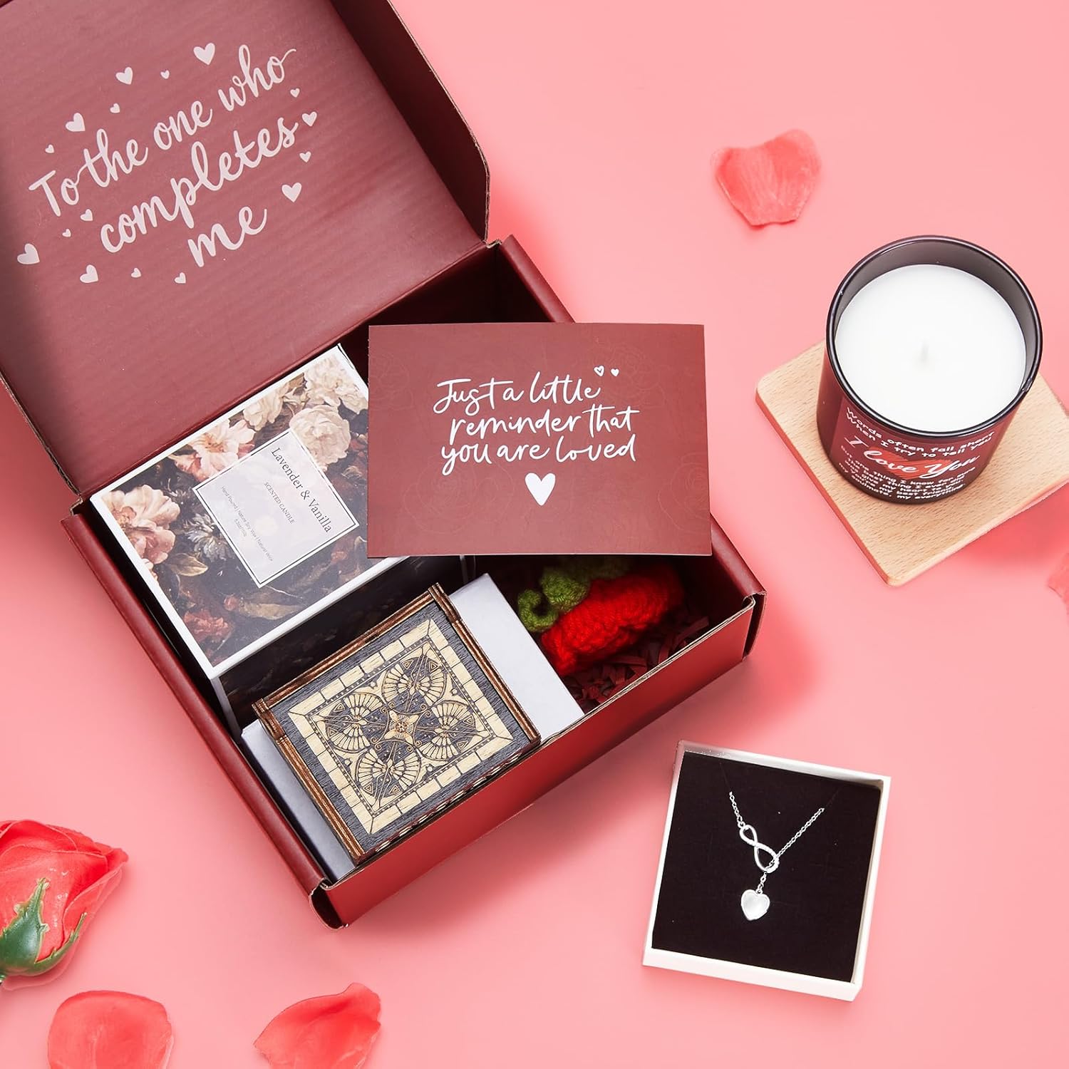 This isn’t just a gift – it’s a whole mood. Inside this charming box: a lavender-vanilla candle with a heartfelt message, a handmade knitted rose that never wilts, a delicate infinity-heart necklace, and a wooden music box that plays a timeless tune. Thoughtful, cozy, and ready to give – no wrapping needed. Perfect for Valentine’s Day, anniversaries, or any moment you want her to feel seen, loved, and totally spoiled.