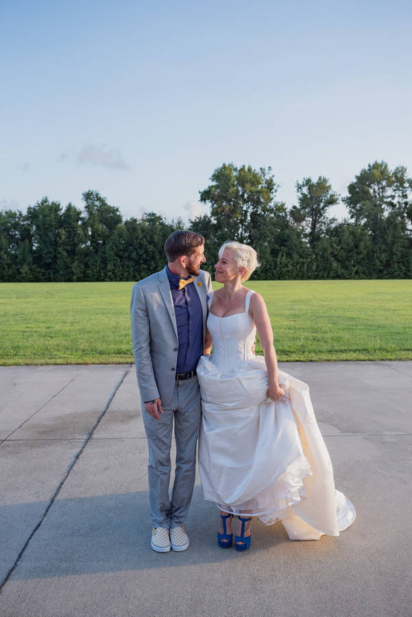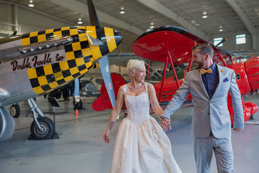 Photographer's Comments: "When I first met these two love birds at a local Panera for our pre-wedding consultation, I just knew right off the bat that they were be a great fit for us to work together. They laughed easily and had such wonderful chemistry together. "We did their engagement session at the Norfolk NEON Graffiti Arts district a few months ago and I was blown away by how easily their posed together and just were so comfortable in front of the camera. "After the shoot, we counted down the days to their wedding. I was looking forward to it because it was held at the very unique Military Aviation Museum in Virginia Beach. They have hundreds of working vintage planes from all over the world starting in World War I. "The highlight of the wedding was when Andrew, the groom, actually got to sit and ride in one of the airplanes as his entrance to the ceremony. The service was held against their private runway with the backdrop of a gorgeous retro yellow plane. "The officiant began with the opening wedding speech from The Princess Bride: 'Mawage. Mawage is wot bwings us togeder tooday. Mawage, that bwessed awangment, that dweam wifin a dweam… And wuv, tru wuv, will fowow you foweva… So tweasure your wuv.' "Instead of sand or candles for unity, they pour coffee and cream into a cat mug- making a tasty mixed drink. It was a unique way to remember their first date plus their super cute cats. "After the ceremony, we shot portraits against the plane and walked around the hangar for some unique and fun portraits. Their favorite plane was a yellow one that said “Double Trouble” which of course matched their personalities but also matched their wedding colors of yellow and purple. "Heidi, the bride is a talented pastry chef and teacher so of course her business, Brite’s Delights, had to create her own custom three layered cake. "We danced the night away with Astro Dj’s and laughed at the custom photobooth by MA Media Group. Mission Barbeque kept everyone fed and happy with unlimited sweet tea and pulled chicken. "Overall, it was a fun-filled and love-filled evening."