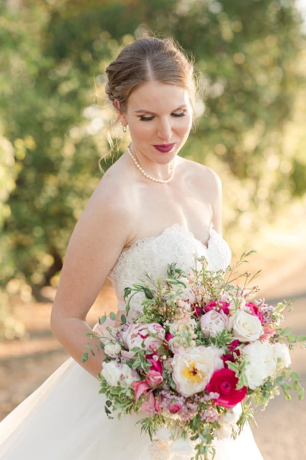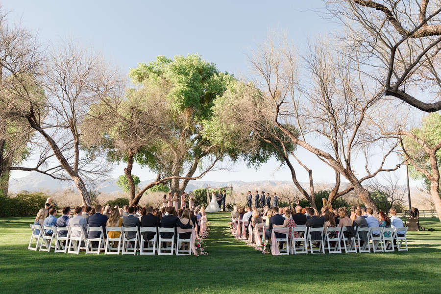 Photographer's Comments: "Christa and Robby celebrated their outdoor wedding at the beautiful La Mariposa wedding venue in Tucson, Arizona–the warm days and cool nights really make spring in the desert one of the best times to get married!! It was a relaxed, easy-going day starting with a warm embrace at Christa’s first look with her dad and then a rush of emotions during her first look with Robby. We were able to spend most of the day taking pictures of the two of them, their family, and friends before heading to the ceremony. First looks don’t take away from the moment you are walking down the aisle, as is evident by the joy on Christa’s face and the welling of anticipation from Robby. I like to say that you get two special moments of seeing each other for the “first” time instead of one because you will never be able to anticipate how you will feel when it’s actually time to get married! Plus you get to spend all day hanging out with your best friend!!! "Seeing someone’s planning and color story come to fruition on the wedding day is something I very much look forward to each wedding I photograph. Christa and Robby chose blush, dusty rose, ivory, and navy blue as their color theme with lots of greenery and champagne gold. I adored her mismatched, flowy chiffon bridesmaid dresses with varying shades of pink. Their florals were natural and organic, yet full of vibrancy. She also wore her mother’s pearl necklace and grandmother’s bracelet! "Christa and Robby’s day was absolutely perfect…the details were beautiful and the moments were special as they were surrounded by their loving families and friends celebrating the start of their lives together. You can feel the laughter going through their images and see how much they love to dance, as they ended the night with a sparkler tunnel followed by a spontaneous dance as their guests circled in around them. It was truly a joy to be a part of such a special day!"