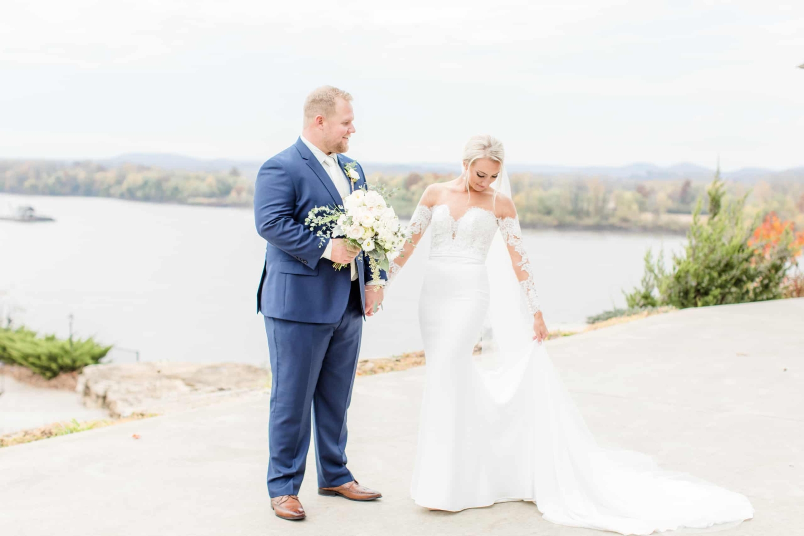 Photographer's Comments: "'Neutral wedding colors.' If there were love languages for photographers…neutral wedding colors would be one of them. Danielle and Jake’s gorgeous outdoor wedding at Hermann Hill Wedding Venue was such a beautiful end to my 2018 wedding season and highlighted the lovely colors and landscape of Missouri during Autumn! From the neutral lush florals, to the Jimmy Choo bridal shoes, to the baseball bat mugs, to the most perfect wedding dress, and the on-point blue suits…this fall wedding was nothing short of breathtaking! "Even more lovely than the details, florals, and venue was the love and commitment that was being celebrated by their friends and family. The bride and groom were so clearly a perfect match for each other, and it showed in their every move on their wedding day: they held back tears while reading the sweet letters written to each other; the way Jake looked at Danielle the entire day with such sweet adoration and love; the sweet smiles they gave each other when they thought no one was looking; and even gently holding hands during toasts. To say the least, their love for each other was so very evident throughout their wedding day and was so beautiful to photograph. "If I were to write a fairy tale that ended with a happily ever after wedding…this would be it. Danielle and Jake’s fall wedding was such a perfect representation of their love for each other, and it was a privilege to witness!"