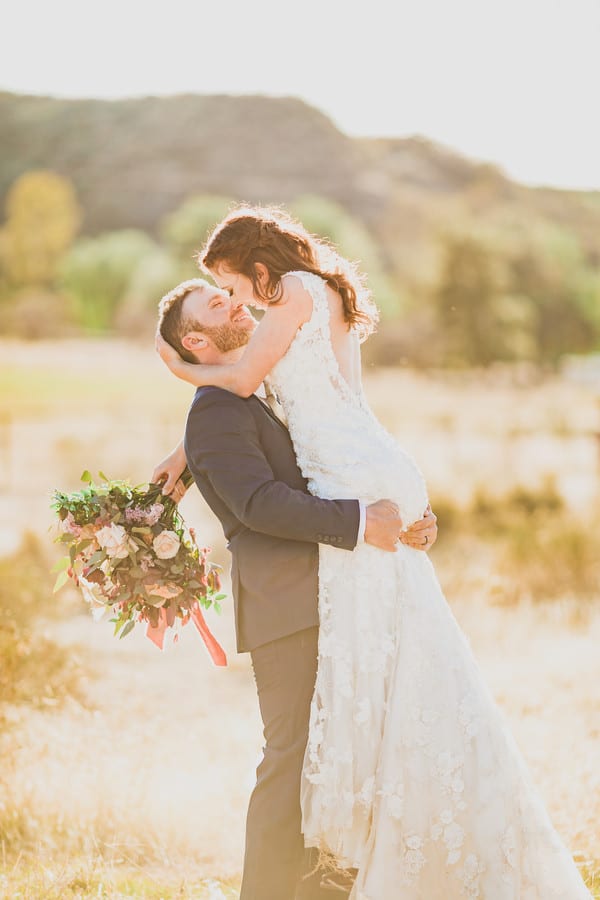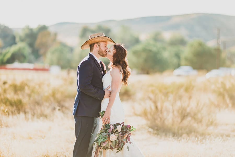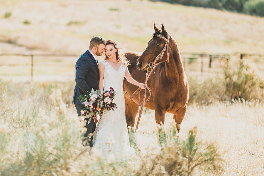 Photographer Comments: “Imagine yourself standing in a big open field with a soft breeze blowing through your hair. The grass ripples in golden waves, and a rocky hillside rolls across the background. The rest of the world seems to melt away. That’s what inspired this shoot; a natural, dreamy location where a bride and groom could get away and focus just on each other.“Western style meets classic elegance. The champagne and deep violet roses paired with lots of greenery looked stunning under the golden sunlight. The dusty sunset hues were perfect for a fall wedding out on the aptly named Rose Gold Equestrian Ranch.“We incorporated equestrian details on the cake to emphasize the couple’s style and personality. I love the pictures of the bride and groom each donning the cowboy hat—he looks extra sharp and handsome, and she looks ready to ride away into the sunset with her man. The intimate pictures of the two of them look like scenes from a heart-melting romance story.“I had so much fun living my childhood dream vicariously though this shoot. Who needs a fancy venue when you have a beautiful piece of the world like this?! I can’t imagine a better place to say, I do for the wild at heart.”Gallery