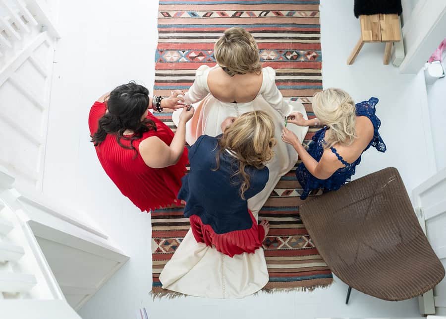 Bride’s Comments: “Over the past three years, Peter and I have spent most of our time together on Shelter Island, either working on or sailing his Stevens 47 sailboat, Valfreyja. I think it was about two months into dating when I found myself helping fold the sails for the winter, in the pouring rain, wearing a bright red rain suit, that I realized that I must really like this guy. It also helped that a man on the next boat yelled to Peter, “if she’s out here in this weather helping you, she’s a real keeper!” So when it came to picking a location for our wedding, there was no question it would be on Shelter Island and the boat would need a starring role. When we visited Ram’s Head Inn, which has its own harbor and moorings, along with stunning views, amazingly good and understated elegance we knew we had found our venue.” “When Peter proposed, again in the pouring rain, and again on the way to do something for the boat, I was in the middle of getting my MBA from Wake Forest University, working full time in Private Equity, and living in North Carolina. Therefore, my bandwidth and patience for wedding planning was very limited. I immediately enlisted the help of the wedding expert, Meredith Falk from GLDN Events. We had worked together on events in the past and I knew that I could trust her implicitly and wouldn’t have to micro-manage anything. I vaguely told her we wanted “sort of a Wes Anderson 1980’s Vintage Ralph Lauren feel” and sent her about four “inspo” pics – and with that little amount of information, Meredith took the reins. What is so special about the team at GLDN is that they took the time not only to get to know me, but to get to know Peter and understand what was most important to him – the music and helped him find the Atomic Funk Project that promised no Top 40 songs and kept the entire crew dancing until the very end. They also worked to incorporate Valfreyja and Peter’s vintage Dodge Pickup Truck into the timeline of the day, which took quite a bit of behind the scenes organization. I also can’t thank the Shelter Island Yacht Club enough for their help on the day of as, predictably, the weather was precarious for our trip into Dering Harbor.” “This thoughtfulness also comes through in the care Meredith takes in selecting the right vendors to bring together a couple’s vision from our gorgeous flowers from NT Designs to the amazing rental company Smith Party Rentals that moved heaven and earth for us. Our photographer, Aria, really understood the vibe and was totally up for the adventure while we got on about three different boats, wrangled unruly “pirates,” and ran around in my Grandmother’s vintage furs.” “When preparing the timeline of events, Peter was adamant that he didn’t want to see me in “the big dress,” so it was a lot of fun getting to find two different looks for the day. When searching for dresses, I knew I wanted something really classic and the MillaNova Josephine dress was perfect, but if it wasn’t for the amazingly talented Beverly MacKay of Indian Trail, NC it would not have turned out so beautifully. She took the dress completely apart and retrofitted it to fit me absolutely flawlessly. For our pre-wedding pictures and “afterparty” dress, as soon as I saw the Milly splatter paint dress there was simply no other option. It was really fun incorporating my bridesmaid’s outfits with our vintage- nautical theme. I let my best friends choose their own, with a little guidance from the GLDN Team, they were executed perfectly. “