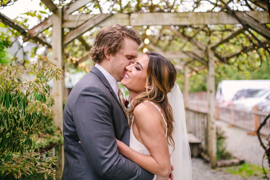 Photographer’s Comments: “Jess and Marty met on a dating app. Marty was the first and only guy Jess agreed to meet up with. After a first date of shopping at Target and a second date including dinner and a movie, the rest is history. On New Year’s Day, high in the mountains of the Pacific Northwest, Marty proposed to Jess in the snow. “For the wedding they went for a theme of simple, rustic elegance. The ceremony took place outside on the grass, at a wooden altar, while the reception was set inside the greenhouse. “Tables were lined with greenery and tan and white linens. Simple but lovely pops of white and pink flowers and gold lanterns and votive candle holders decorated both spaces. “Guests were welcome to wander about the gardens, and it truly felt like the most perfect, beautiful, intimate affair where family could reconnect and celebrate in their love for the bride and groom. “Their wedding day was everything they dreamed. Jess looked positively STUNNING in her silk and lace Claire Pettibone gown, fitted perfectly to her. The back of that dress made everyone’s jaws drop. “Her bridesmaids wore sparkling gold dresses and carried colorful bouquets with pops of pink and sunflowers. “The groomsmen kept it classy with gray suits and matching gold ties, with their own pops of fuschia boutonnieres. But most importantly, they laughed and cried and thoroughly enjoyed their day with all their loved ones.”