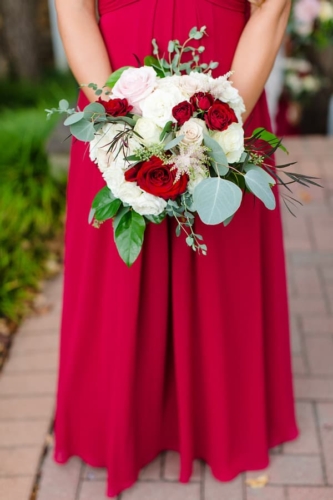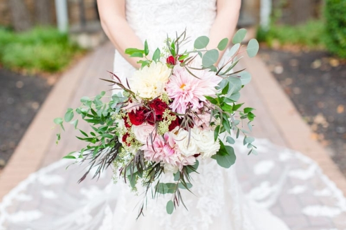 A3: We found an amazing local florist in Northern Virginia. She worked with us to create a custom design for our bouquets and ceremony arrangements. We wanted the pop of burgundy in both the bouquets and boutonnières. I (the bride) also love dahlias and had to have them in my bouquet. The final arrangements were amazing! We wanted something other than flowers on our tables. So, for centerpieces, our florist helped us design three candle and greenery arrangements, which we alternated among the tables in the ballroom.