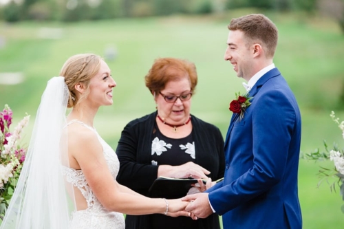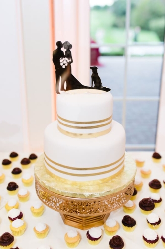 A1: We got married in Northern Virginia on a gorgeous fall day. We wanted to do the wedding somewhere local for us and away from the hustle and bustle of the city (Washington DC). Our venue had a beautiful outdoor ceremony space overlooking a golf course, which was exactly the kind of setting we were looking for. We chose colors that we thought were perfect for fall: deep blue, burgundy, and gold as an accent color. We thought that combination of colors really popped in our wedding photos. While we did not incorporate any cultural or religious traditions into the day, we did personalize the wedding ceremony and reception as much as possible. For the ceremony, or civil celebrant shared with our guests the story of how we met and our 6 year journey together leading up to our wedding. For the reception, we had childhood photographs of us at various ages on the tables to correspond with the table numbers. We also featured a picture of our rescue dog Scout in the rotunda of the venue with a sign noting the donations we made to two animal rescues in lieu of wedding favors.