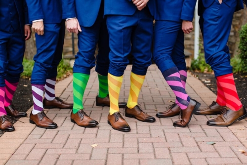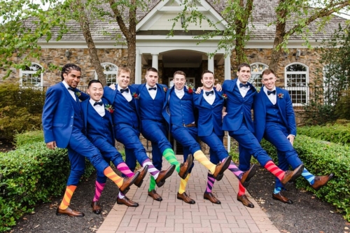 Groom says: I wanted a suit that you could really tell in photos was blue. I wanted something between a Royal and Navy color and found it in Generation Tux. I found the perfect suit on there for myself and all of my groomsmen. I also found blue bow ties to match the groomsmen attire and I wore a white bow tie as requested by my bride. I picked brown shoes (also from Generation Tux) to compliment the blue suits. Most importantly, I bought my groomsmen bright colored socks to give each guy a bit of a unique look.