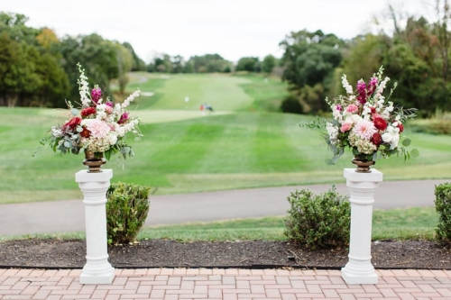 A2: Much of our wedding decor was DIY as we wanted to personalize the space as much as possible. In addition to the custom table numbers with pictures of us growing up, we created and framed a lot of fun signs that we placed throughout the reception space. We also created “did you know” facts about us on the patio tables during happy hour. There were several unique facts about us that our guests may not know. For example, we both wore the same jersey number on our college sports teams or we both can say the alphabet backwards in under 5 seconds! The centerpieces and flowers were not DIY, but we did work closely with our florist to to ensure they tied in well with our wedding colors and the venue space.We wanted the ceremony decor to be simple because we had a beautiful backdrop of a golf course. Our florist pulled together two arrangements to complement the bridal bouquets and they were placed on two columns up front by the bridal party.