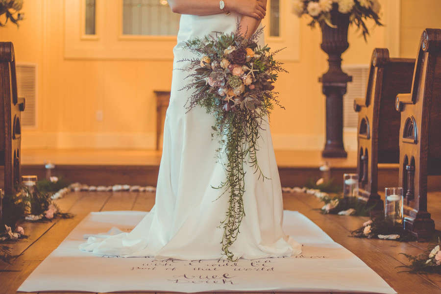 Photographer’s Comments: “I am so excited to share with you our little mermaid inspired wedding shoot! “Our goal was to bring in beautiful colors & romance to a traditional disney love story. This bright and elegant combination was created using golds, teals, pinks, grey & coral to interlace this unique inspirational event. A few of our inspirational elements include the ocean, waves crashing against rocks, succulents to represent the under the sea vibe, & Ariel’s transformation from a mermaid princess to a royal queen. We want to wow brides with the beauty they love & let them know you can create your wedding inspiration from any elements you love without replicating it completely. “I am Krishna Sutherland & I own Krishna Sutherland Photography in Middle Georgia. Creating & designing wedding elements that are meaningful & eye catching is one of my favorite parts of being a wedding photographer. For this styled shoot I was inspired by my love for the little mermaid & obsession for beautiful colors & unique ideas. The Little Mermaid is an iconic movie so many girls fall in love with, from the story line to the fun energy of Ariel’s personality making everyone want to be a mermaid, right?! The disney themed engagements & weddings are everywhere but our team took this vision to another level by looking for cohesive elegant trends within the movie. I adore the love that Ariel has for her Prince Eric who just happens to live in a white castle with a red roof- therefore sparked my idea to host the little mermaid wedding at the stunning Tybee Island Wedding Chapel. I decided I would need a real life couple as my main models & knew just the couple to fit the part. Lauren & Bradley Brooks have been madly in love & got married in September of 2015. Their lasting love always shows when they are together & they share a passion for subadriving. They love the water & Lauren found her perfect Prince in Bradley so I knew they would fill our images with that passion I wanted. I had a strong vision for this style & our team went above & beyond to create this look! “The Tybee Island Wedding Chapel located on Tybee Island Georgia helped create a breathtaking venue any bride would love from the incredible grand ballroom to the famous Chapel that was featured in The Last Song. The chapel was moved after the movie & brought up to island codes adding the ballroom & just a few minutes drive from the beach! If you are looking for a fairy tale dream venue this is a must see! “Since Bradley custom made Laurens engagement & wedding ring designed perfectly for their love story I was honored to use their rings in our shoot. The rings were designed by Steel’s Jewelry in Valdosta Georgia & will surely take any girls breath away. As every marriage is unique I believe the beautiful ring that symbolizes your marriage should be just as unique. “Our amazing wedding gown was a Carrie’s Bridal Collection design style 4187 & can be found at their second storefront, Carries Bridal Collection in Macon. Their other location is in Atlanta. If you are looking for your princess dress they are a must visit with all their pieces design by Carrie herself. They cater exclusively to brides carrying only bridal designed gowns without costing thousands of dollars. “Our table & chairs were provided by the venue & I hand cut chiffon fabric for our chair sashes which helped us depict a beautiful setting under the chandelier filled ballroom. We felt this area brought the most to our layout with a truly royal ambience. Infinitely Elegant Designs crafts stunning woodwork & supplied our coastal Bride & Groom chair signs. Dee with Willow Gardens traveled from Florida and designed an amazing succulent table spread. Echeverias, mixed succulents with strings of bananas & strings of pearls were used in the design on the tables as well as our bouquet & boutonniere. You can find the beautiful eco friendly sola flowers throughout her creations which she customizes the color for each event. Willow Gardens specialized in succulent wedding designs & is fabulous to work with. Alongside the greenery & succulents is a handmade oyster shell garland created by Vintage Rain to drape our tabletop over a grey chiffon runner. This unique piece is not easily found & extremely time consuming. We love the beauty the pearly oysters bring to our vision blending royalty with our under the sea princess inspiration. The tabletop place settings are through our favorite vintage, china & glassware rentals provided by The Prissy Plate Company in Atlanta. Their collection of colored goblets, mismatch of china, and napkins brought our style to the next level with the beautiful colors & classic touch. To assure we had the romantic feel to our style we added assorted glass candle holders with floating candles & taper candles throughout our setup. Our dazzling sea glass table numbers by My Letters From Eden add luxuriory & the perfect pop of color to our setup. “J. Graham Lettering composed gorgeous oyster shell place cards & we just do not know how he does it, but the calligraphy on each shell is beyond perfect. They are definitely a must have for any coastal wedding event! “Our ocean inspired three tier cake designed by Make It Cake in Middle Georgia was beautifully crafted & the perfect addition to our shoot. From the delicate swirling colors to the lovely isomalt sculpture that coast down the tiers convey the crashing waves we see as Ariel watches Eric on her iconic rocks. “Our favors table features our birchwood anchor guestbook another gorgeous product from Infinitely Elegant Designs. They custom made this engraved anchor for the shoot & we know brides will love this alternative guestbook to display in their home. Another beautiful sea glass sign by My Letters From Eden & gold sea inspired toast glasses by The Prissy Plate Company. P.S. Sweets bakes incredible creations with her cookies. We are in love with her delicious elegant starfish & seashell