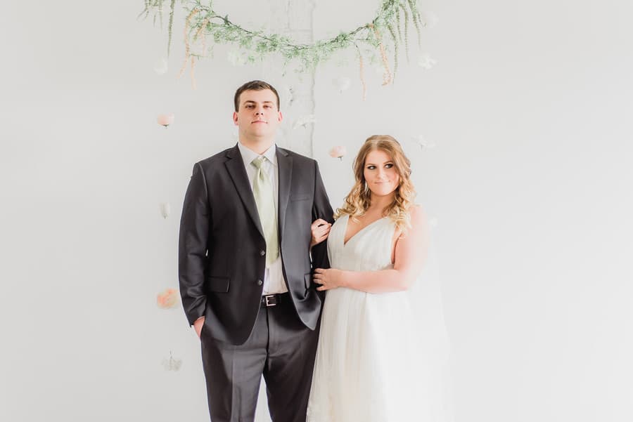 Photographer's Comments: "From the Styling With Sam Bridal Details workshop, this styled shoot is full of soft romantic details and modern bridal portraits.  The hanging floral background was a DIY piece that any bridal team can pull off, and the modern color palette can leave all the focus on the loving couple. "The beautiful indoor location is a new take on modern couple portraits, and really brought out the beautiful light in the building.  It’s a perfect mix of minimal and romance, and helps the portraits keep the emotions of the couple.  The details being on the more non traditional side, and the attention to cohesiveness makes for a beautiful story."