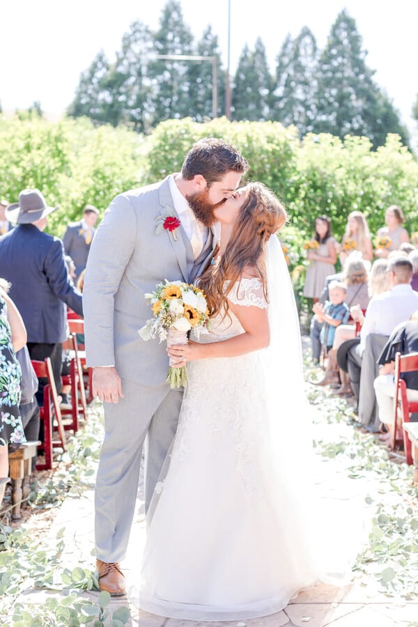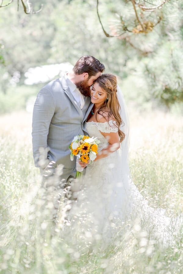 Photographer’s Comments: “Julian, California is a little mountain town, world-famous for its apples. Set at the top of rolling green hills, made up of the largest boulders I’ve ever seen sits the beautiful Apple Lane Orchard! It’s a working apple orchard and cider processing company, and recently, they’ve become a wedding venue! Only a few minutes up the hill is Inspiration Point, the most gorgeous outlook that was the perfect backdrop for Stephanie & Levi’s first portraits as husband and wife! “In case you don’t live in San Diego, let me tell you a little something about 2019. The Chinese calendar states that it’s the year of the pig, but it has been the year of the RAIN!!! “As Stephanie & Levi’s wedding day got closer and closer, I was so worried that their supposed-to-be sunny, summer, mountain wedding would turn into a dark gray mess. But, true love conquers all — including the weather! As the June gloom faded away, the chilly, gray morning turned into a sunshine-filled, unusually warm afternoon, with just the perfect amount of a breeze (hello perfect veil shots). “But even if the weather hadn’t been so cooperative, I knew it was going to affect Stephanie and Levi. After shooting their engagement session, and getting to know these two, it was clear that they were not just celebrating a day. They were celebrating the legacy of love that they were creating together. Plus, these two are just down for a good time, and a little rain wasn’t going to stop anyone! “The theme for their wedding was rustic, country, family and fun. The couple didn’t want to focus on wedding fluff, and instead focused on the bonds between their family and friends! With a color palette of taupe, gray, yellow and sage, I knew that set in the valley of Pine Hills, everything was going to be just beautiful. Stephanie is a true country girl at heart, and let the world know it with her cowboy boots and turquoise jewelry! Her bridesmaids also donned boots and all held sunflower bouquets. They served a BBQ dinner and danced to country music with red solo cups in hand. “Levi is a man of few words. A gentle giant if you will. Some of my favorite parts of the day were watching the love he has for Stephanie appear across his face! His reaction to their first look was just darling. And his expression watching his beautiful bride walk towards him up the aisle was absolutely priceless. I loved watching as they said, “I do,” not only to each other but as Stephanie officially become a second mother to Levi’s son, Reed. (I’m not crying, you’re crying!) “Friends and family really do mean the world to this couple, and it was clear that Stephanie and Levi mean the world to their friends and family too!”