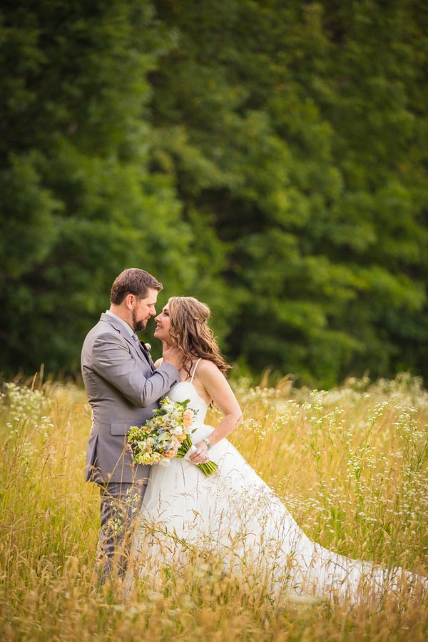 Photographer’s Remarks: “Valaree and John are one of our all time favorite couples that we have worked with. They are madly in love, absolutely gorgeous and FUN! I mean what more can you ask for? “When we got to the venue I saw this gorgeous big open area with gorgeous long grass and I immediately wanted to do the first look there. Normally I would never ask a bride to walk through that grass in their dress. However, I knew that John and Valaree would be just as excited as I was, and the spiders that were jumping around in the grass wouldn’t bother them at all, lol. “The entire day was filled with so many special moments. Valaree paid tribute to her Dad who had passed away throughout the day. While she was getting ready she wore a red flannel shirt that was her fathers. “The boots that she wore were given to her by her father and the hat that her brother wore as he walked her down the aisle was also her dads. “Outside of the reception they had this beautiful wooden ladder where they displayed pictures of their loved ones who had passed. It was such a beautiful and unique way to pay tribute to their loved ones. “John and Valaree definitely love to laugh with one another and they did that so much throughout the day. During the ceremony while placing the ring on Valaree’s finger he added a little something extra to his vows that had us all laughing. Then when it came time for the first kiss, his best man had to help him out and give him a few tic tacs before he did the deed. “Valaree just did not stop smiling. Oh and it didn’t end there! During the reception when it cam time for the garter pull John had another trick up his sleeve. Valaree was in tears! “The night ended with a lighted balloon release which was another tribute to her daddy, sending the balloons up to Heaven so that he could celebrate as well. “Make sure you take a peek at the video if you have a few minutes. They really are the sweetest, most fun couple ever!