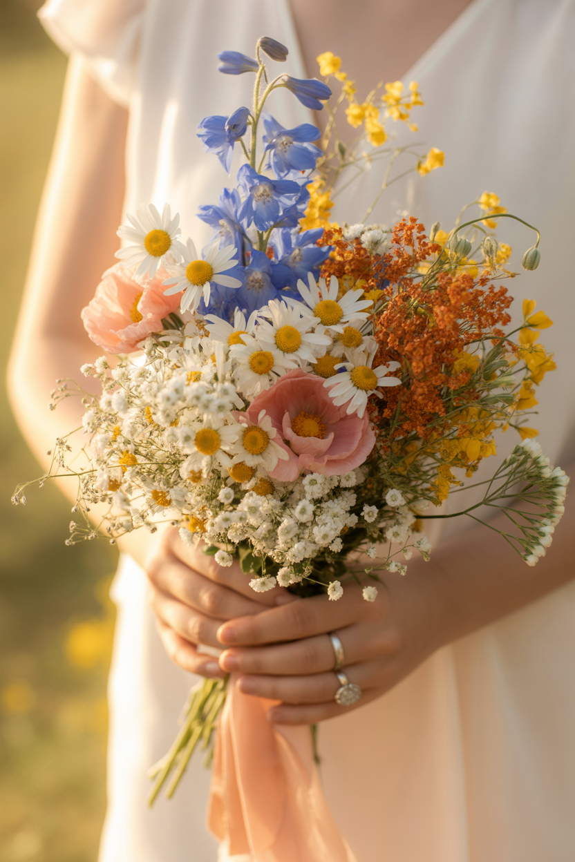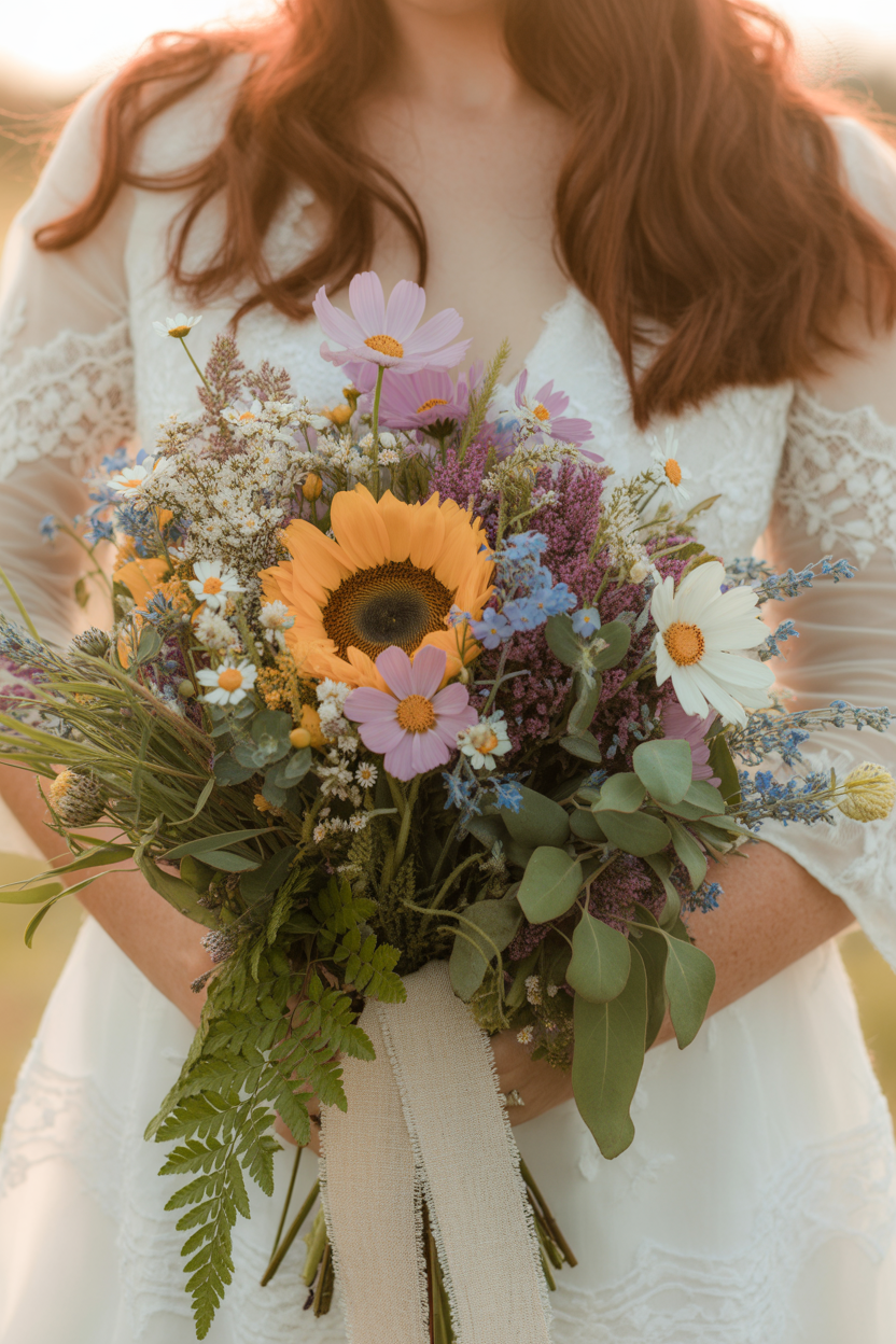 There’s something irresistible about a wildflower bouquet. It looks like you wandered through a meadow on your wedding morning and gathered the prettiest blooms you could find — romantic, relaxed, and completely you.