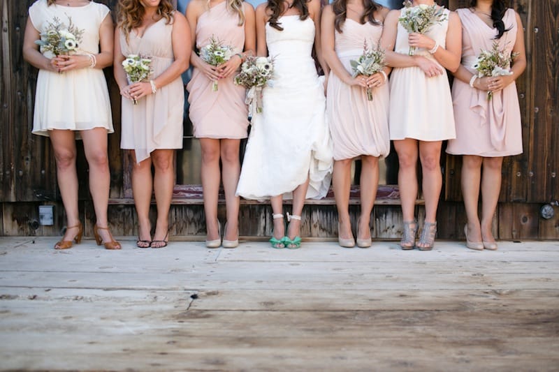 The wedding party below looks like they were given a color range between grey/blue, peach and pink, with instructions of an empire waist and belt. The bridesmaids completed the look by wearing their hair down, same bouquets, and most importantly mandatory cowboy boots! See, it can work!